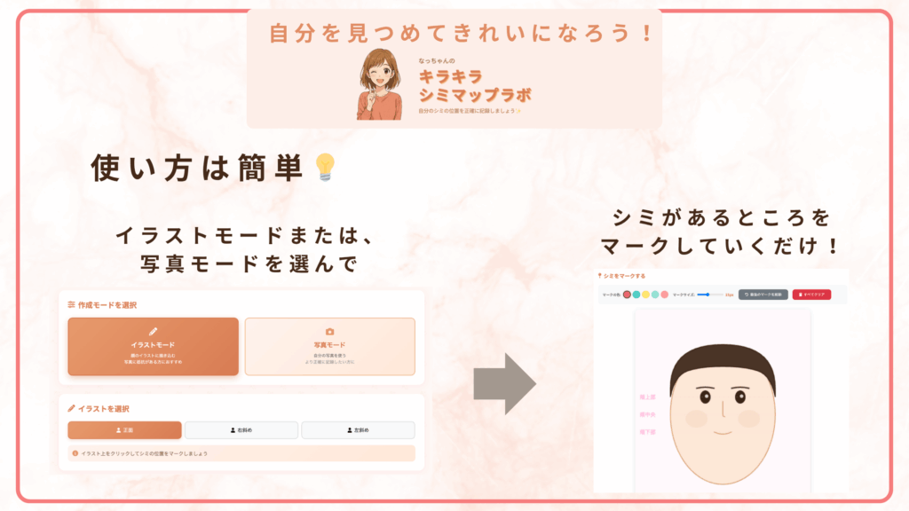 シミマップの作り方として、自然光が入る窓際で、スマホで自分の顔を撮影します。正面、右斜め、左斜めの3枚。写真で見ると、普段気づかないシミも発見できます!