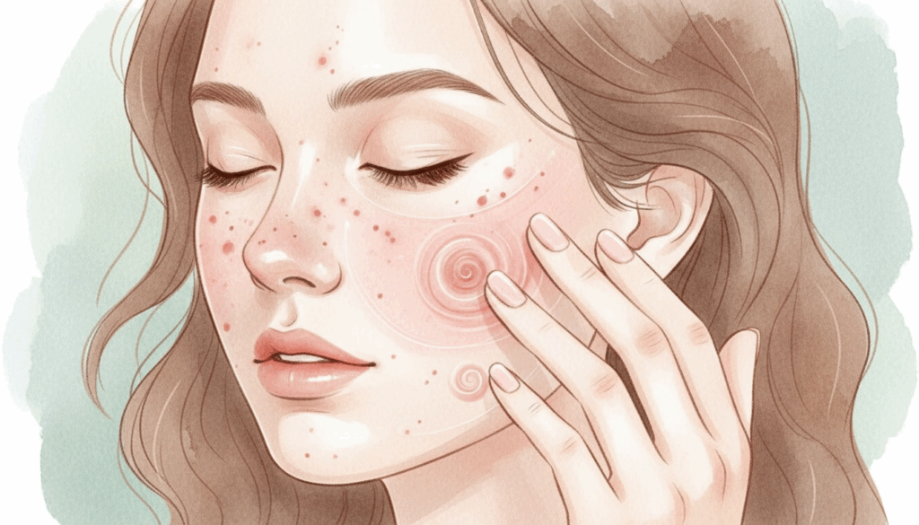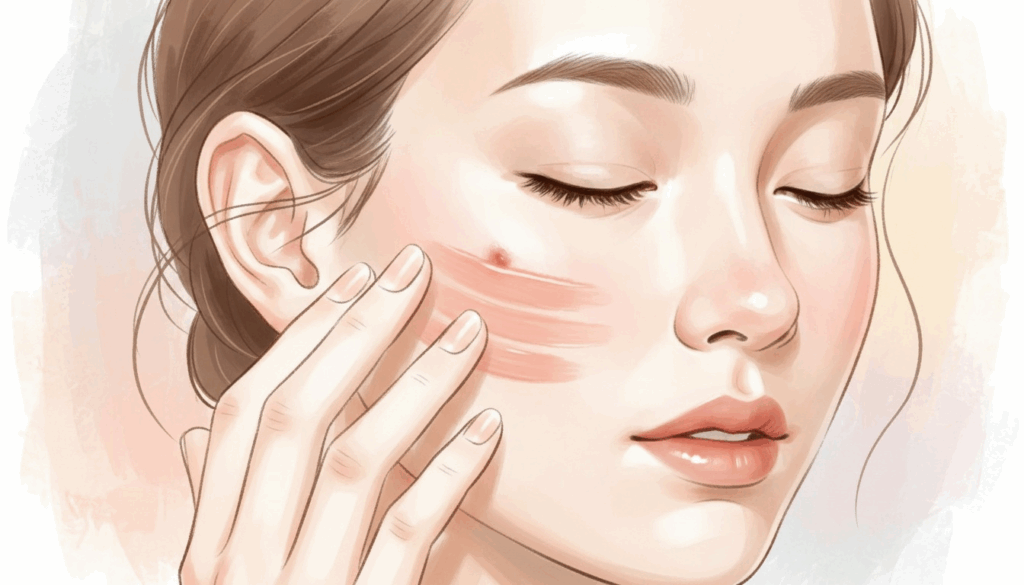 保湿レイヤーでは、化粧水→乳液(またはクリーム)を頬に「押し当てて」浸透させます。こするのは絶対にNGです。