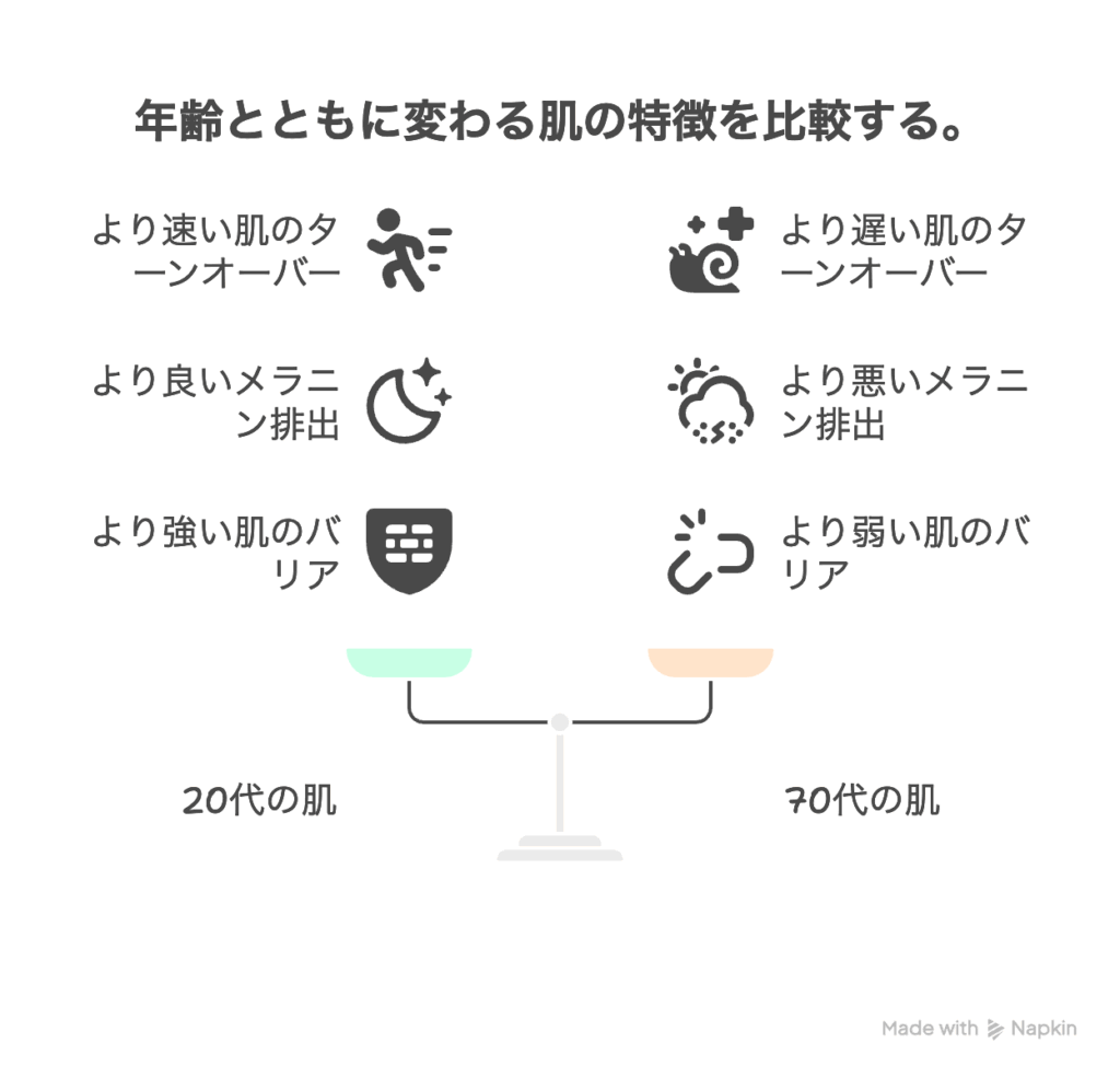 20代では約28日だった肌の生まれ変わりサイクルが、70代では約100日にまで長くなります。これって驚きませんか?私も最初に知った時は「え!3倍以上も!?」って声に出してしまいました(職場の先輩に心配されちゃいました💦)