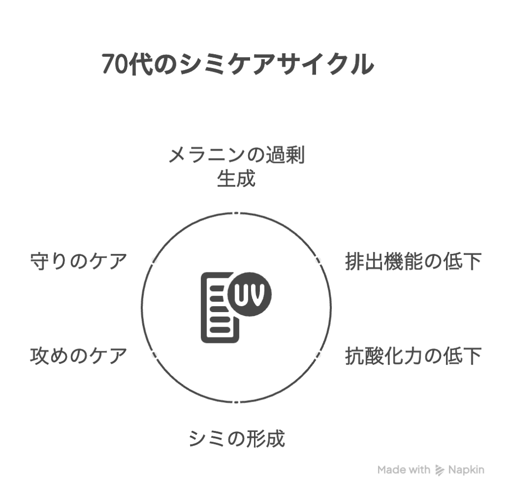 シミって実は、お肌を紫外線から守ろうとする防御反応なんです。でも、70代になると:
