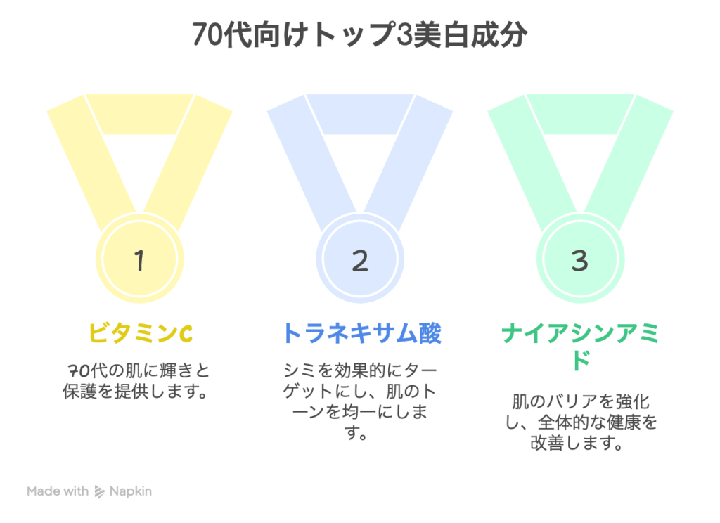 そこで今回は、美容マニアの私が徹底的に調べた「成分で比べるシミケア」をお届け!ビタミンC、トラネキサム酸、ナイアシンアミドの3つの主役成分を中心に、70代の先輩におすすめの商品を5つご紹介します。