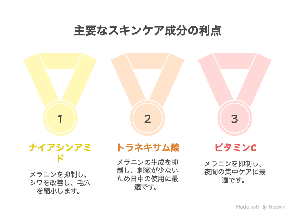 - トラネキサム酸:刺激が少なく日中も安心