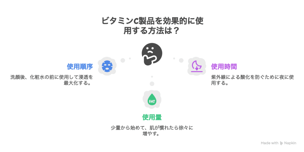 - 酸化しやすいため、安定性の高い「ビタミンC誘導体」がおすすめ